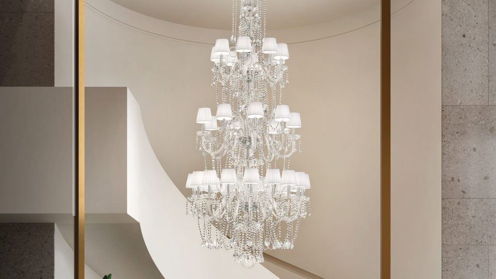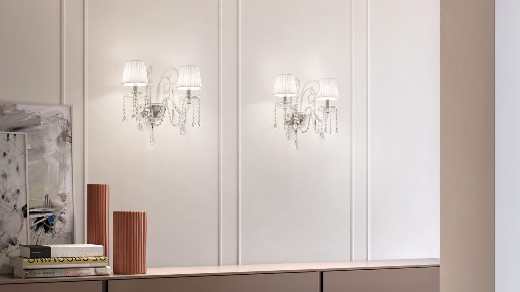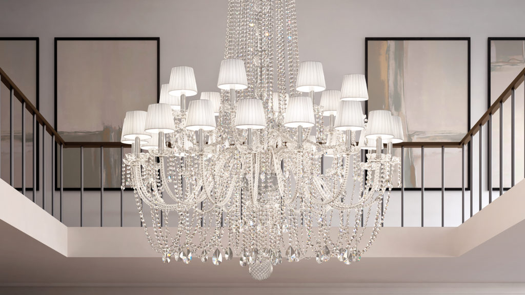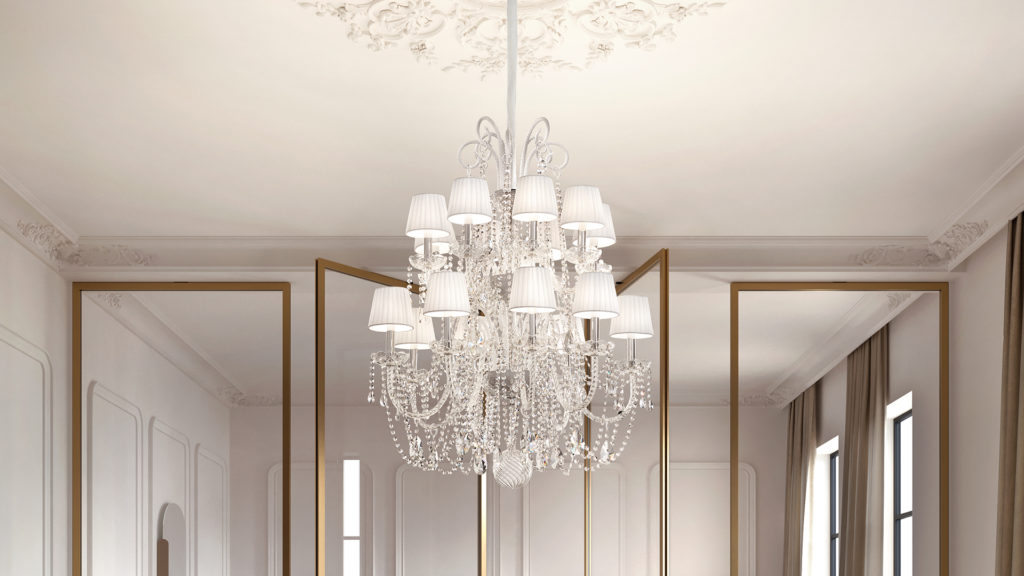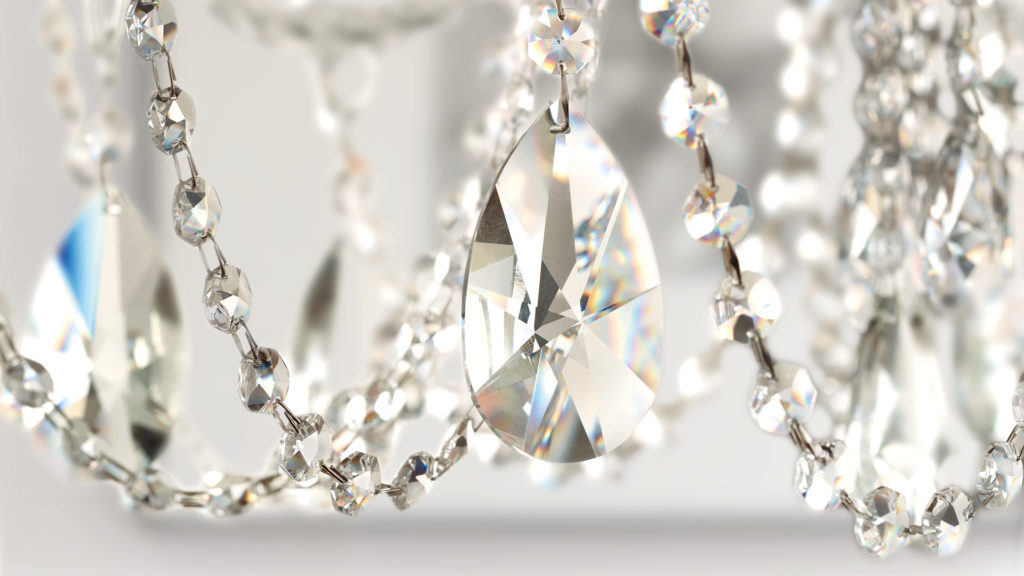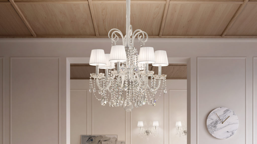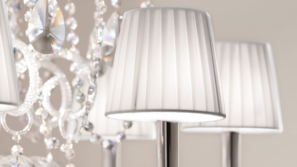 Metal frame with blown glass arms. Clear glass or clear crystal pendants. Pongee lampshades.