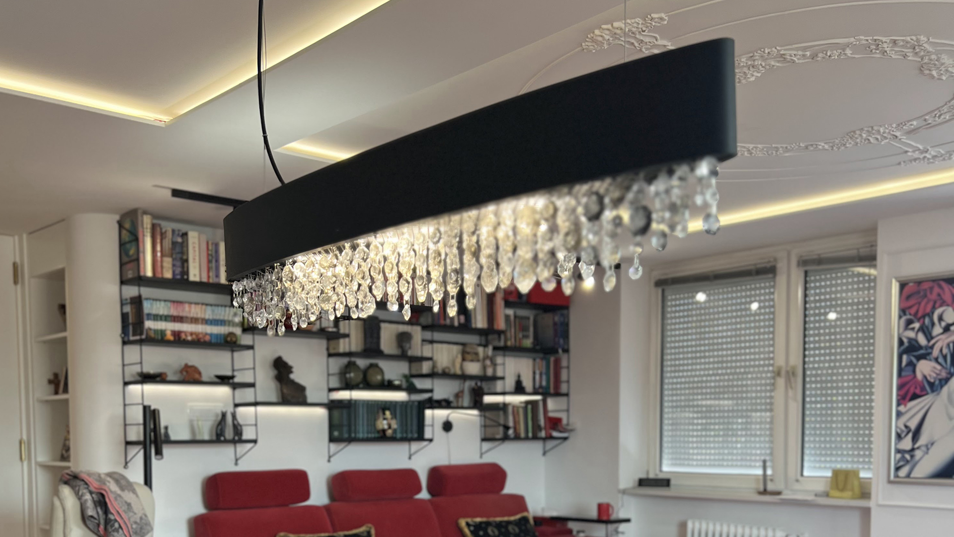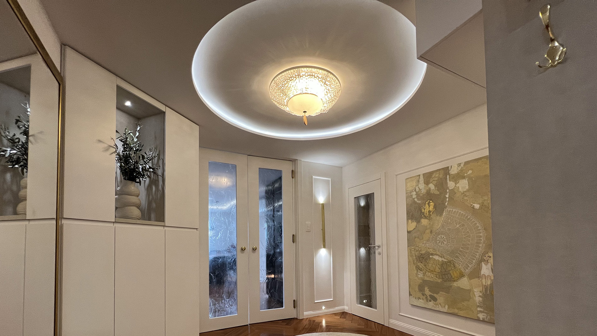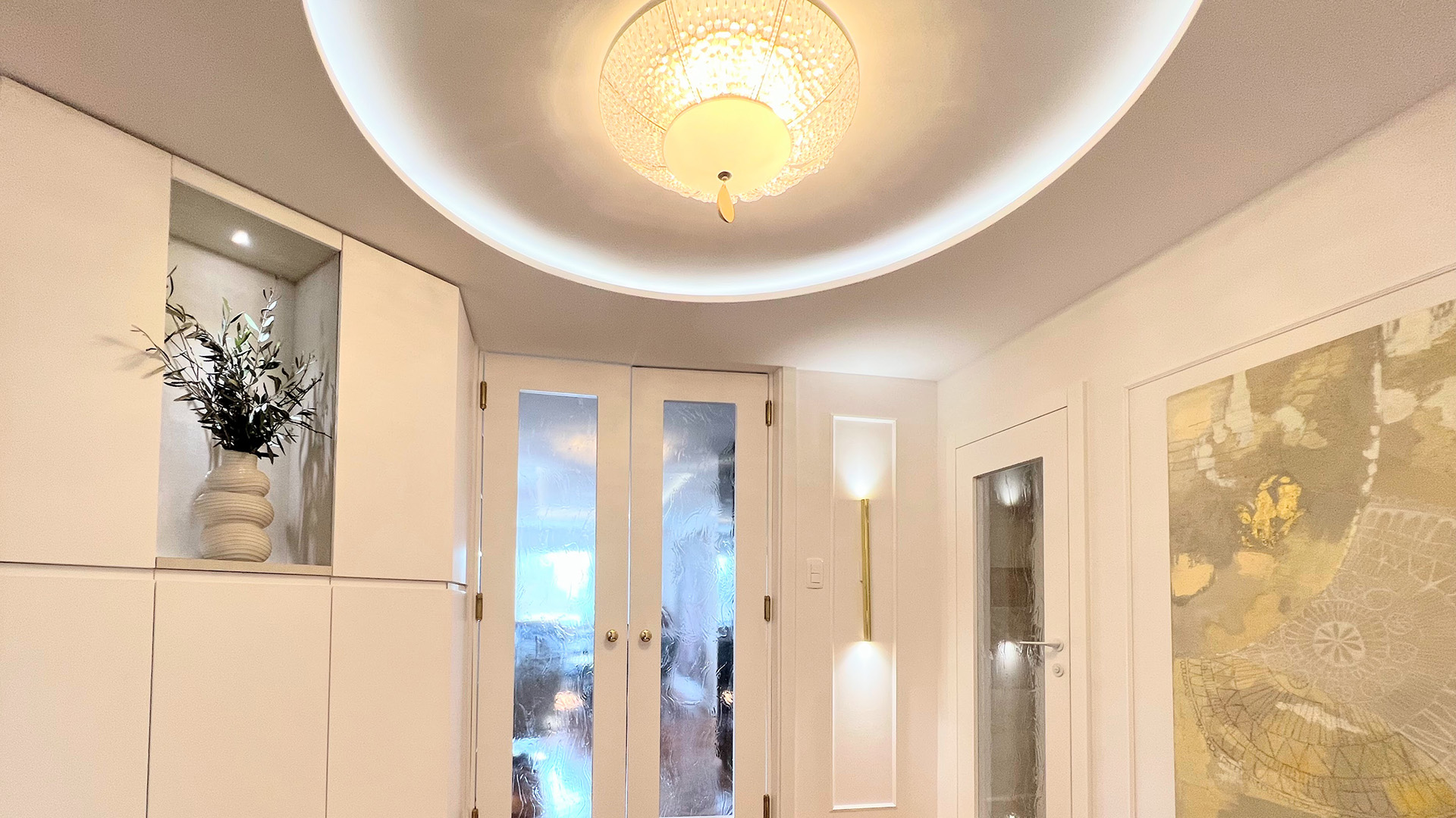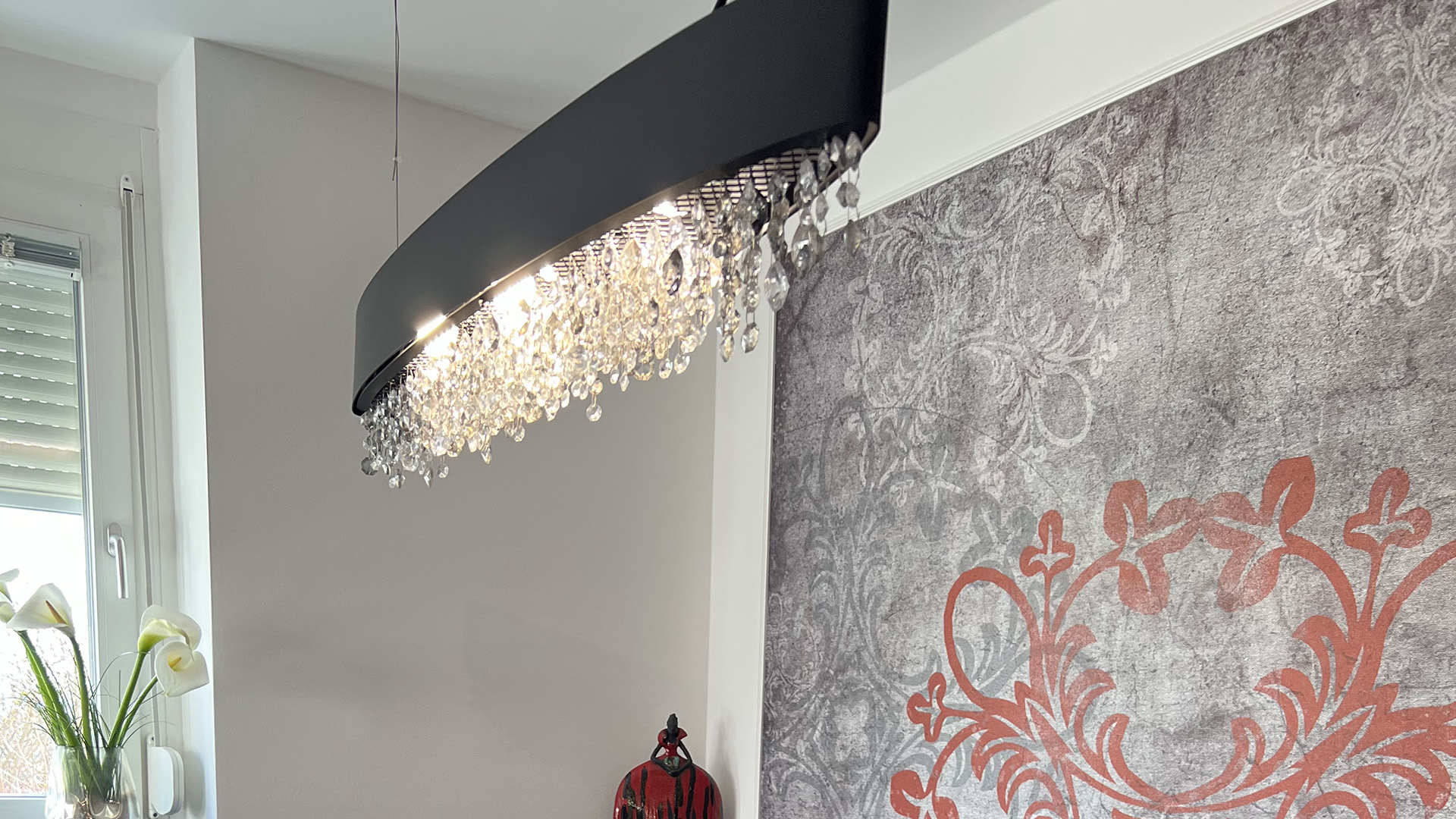 The Noblesse ceiling lights up the white entrance, while the Olà oval suspension draws the light on the dining room table.