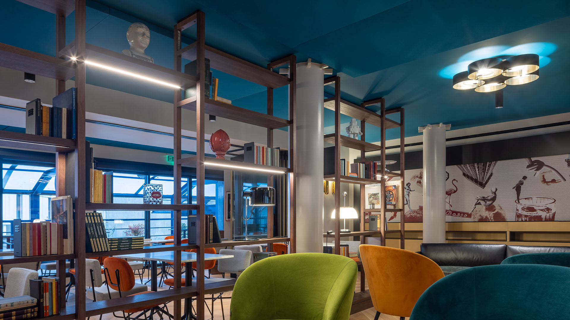 The coworking space is lighted up by the Sound, iconic product of Masiero, declined for the occasion in an elegant bicolor black/ gold.